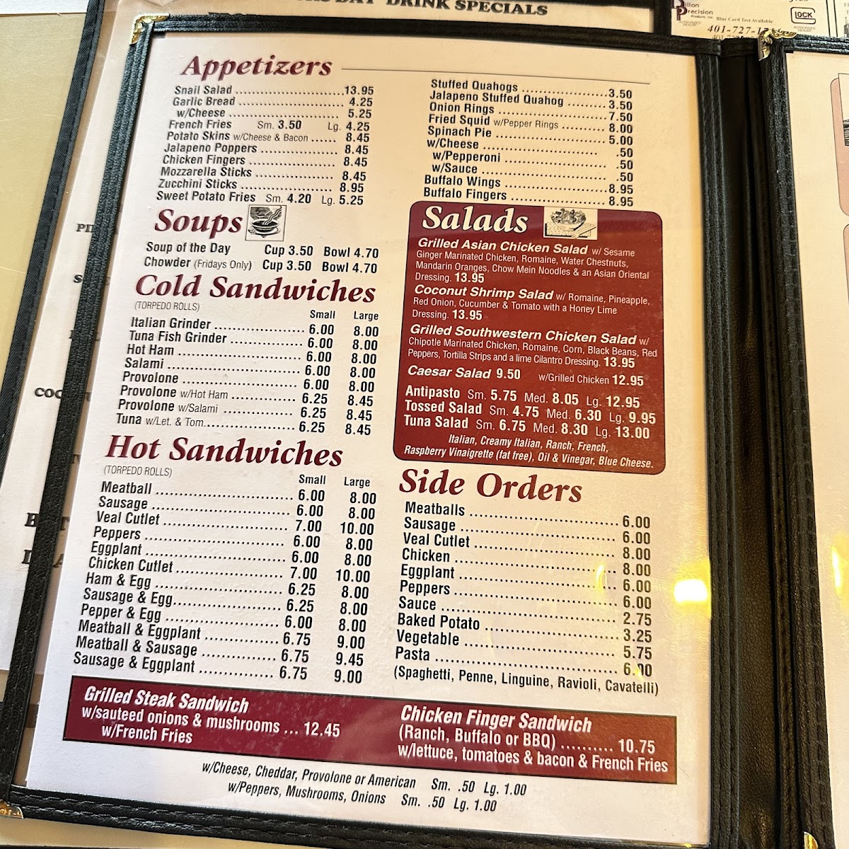 In addition to main dishes, the menu features cold and hot sandwich selections including Italian grinders, salami, tuna fish, and provolone sandwiches, available in both small and large sizes. Lunch specials offer convenient meal choices like grilled chicken breast sandwiches, codwich sandwiches, and Caesar salads with grilled chicken, often accompanied by sides such as French fries or coleslaw.